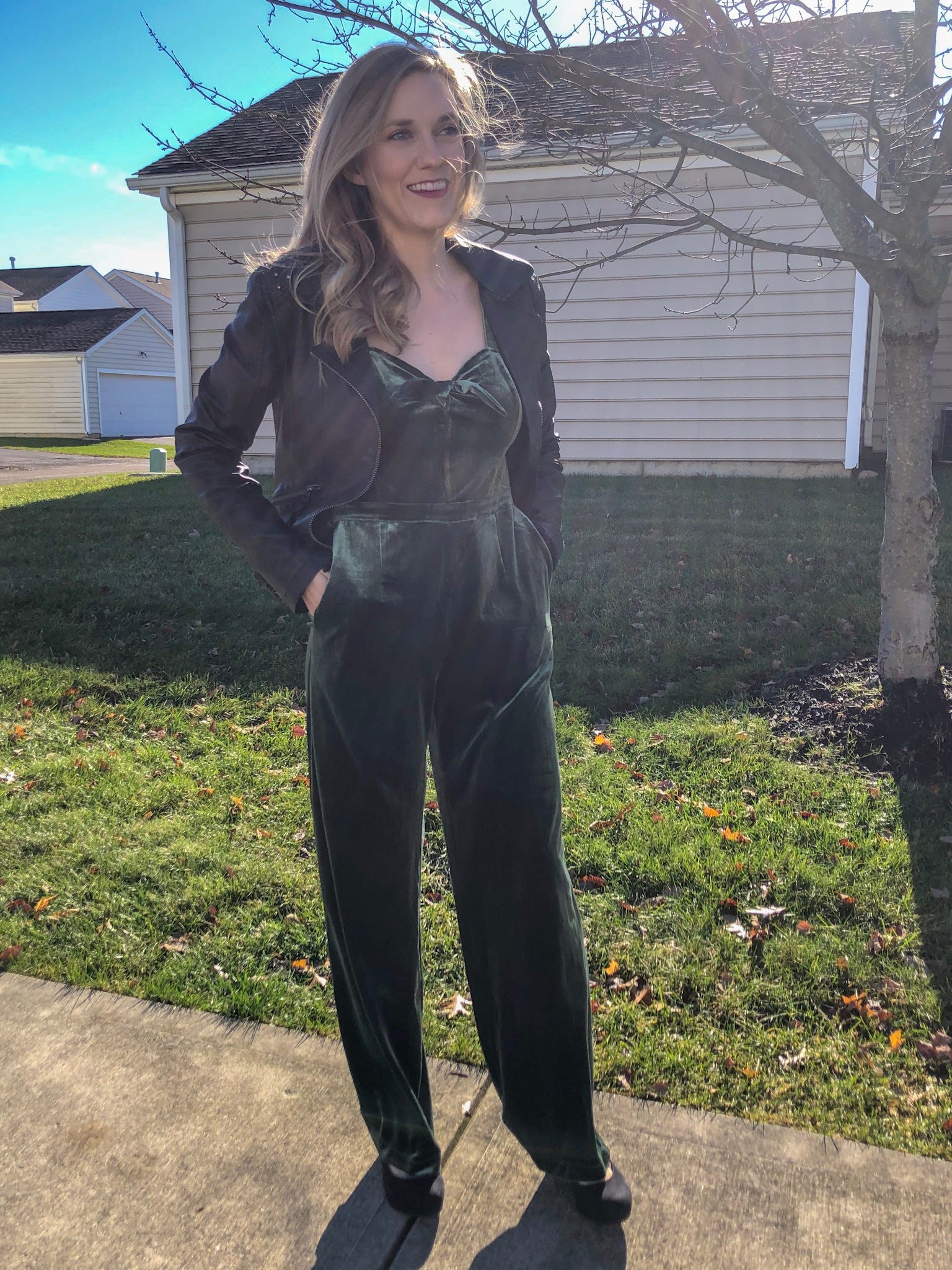 The Friendsmas Bash If I’m being real, my friends and I usually gather at Buffalo Wild Wings in t-shirts and jeans, ready to feast on the cheapest food on the menu, and those are some of my favorite hours of each year. However, if we were to class things up a bit (please, let’s never), I'd step way out of my comfort zone and try my best to 'rock' a jumpsuit. There are so many gorgeous jumpsuits this year, but I’m in love with this green number that even came in petite sizing. It’s warm and has pockets (I will literally buy even an ugly dress/romper if it has pockets)! This could be styled with a fun blazer for a more sophisticated look, or maybe with a faux leather jacket for some edge. Also, may as well squeeze a second use out of those black booties.