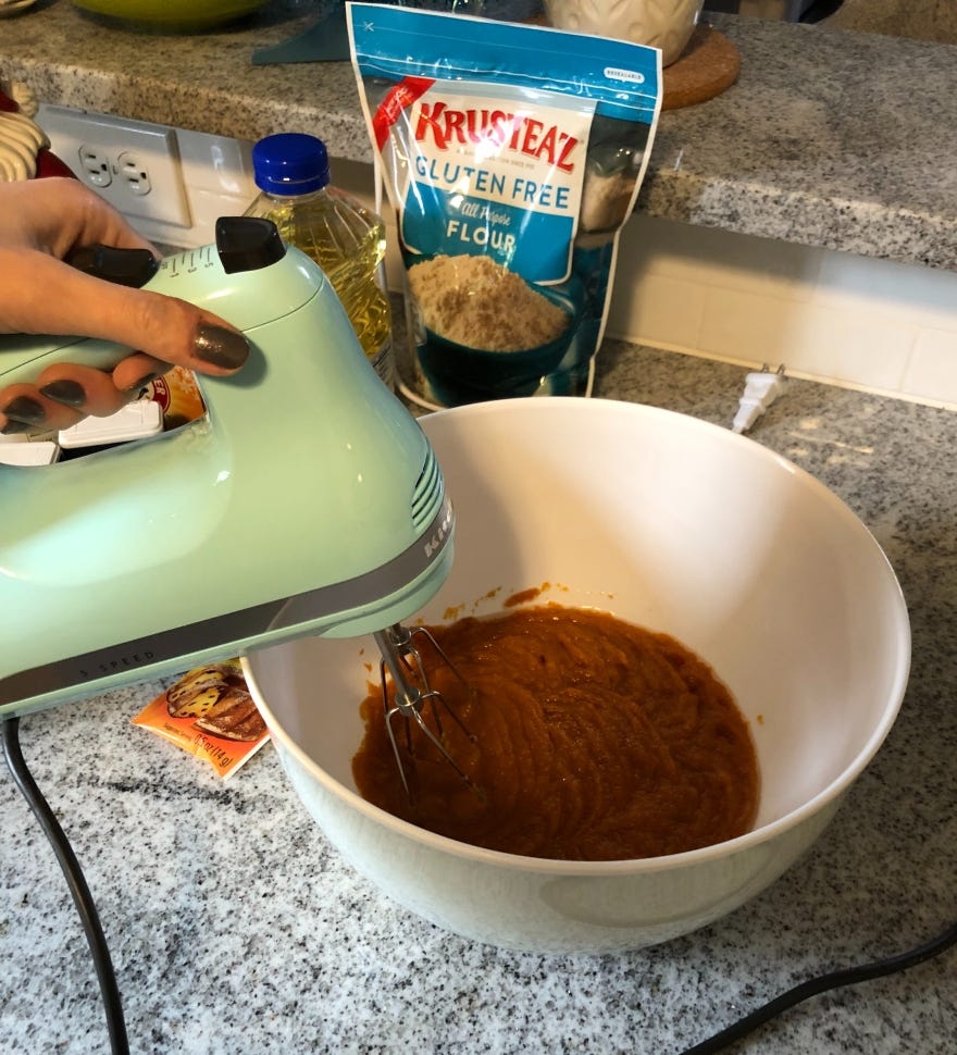 Combine pumpkin puree, sugar, vegetable oil, applesauce and vanilla in one mixing bowl using a whisk or electric mixer.